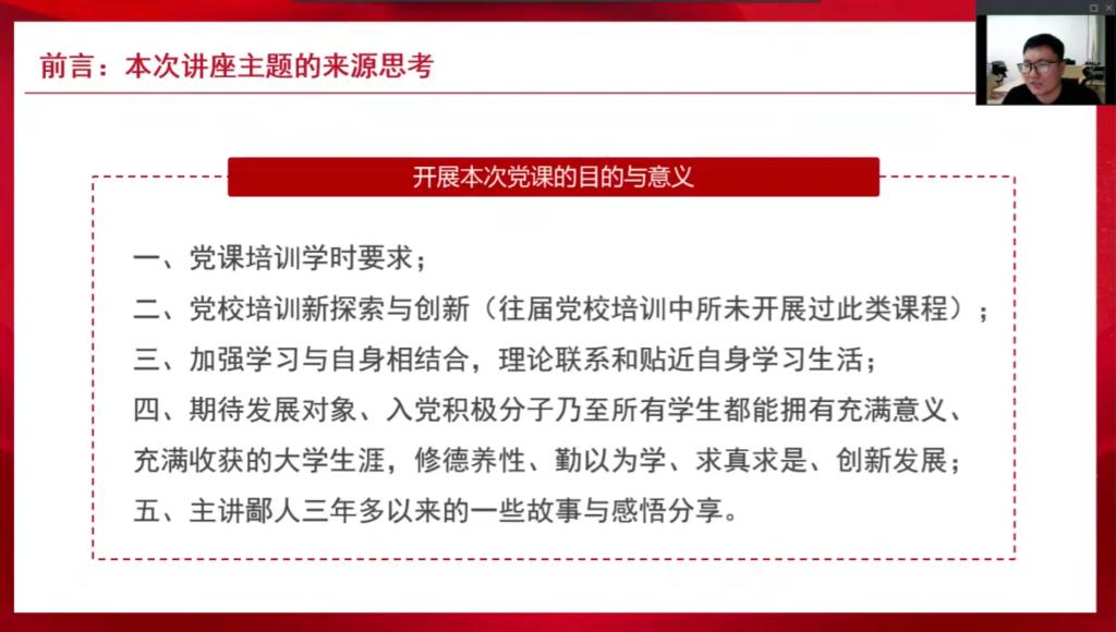 的学生党员提出了思考与建议。他要求同学们把“尚德”作为自己人生发展的前提,以德为先,先立德再求知;勤于学习,善于学习,广泛阅读,在条件允许的前提下积极考研深造;始终坚持“求是”的态度,注重探索性学习,追求真理;敢于“创新”,相信自己的潜力,积极参与各类实践,扎根中国大地,了解国情民情,增长智慧才干,培育创新思维与创新意识。