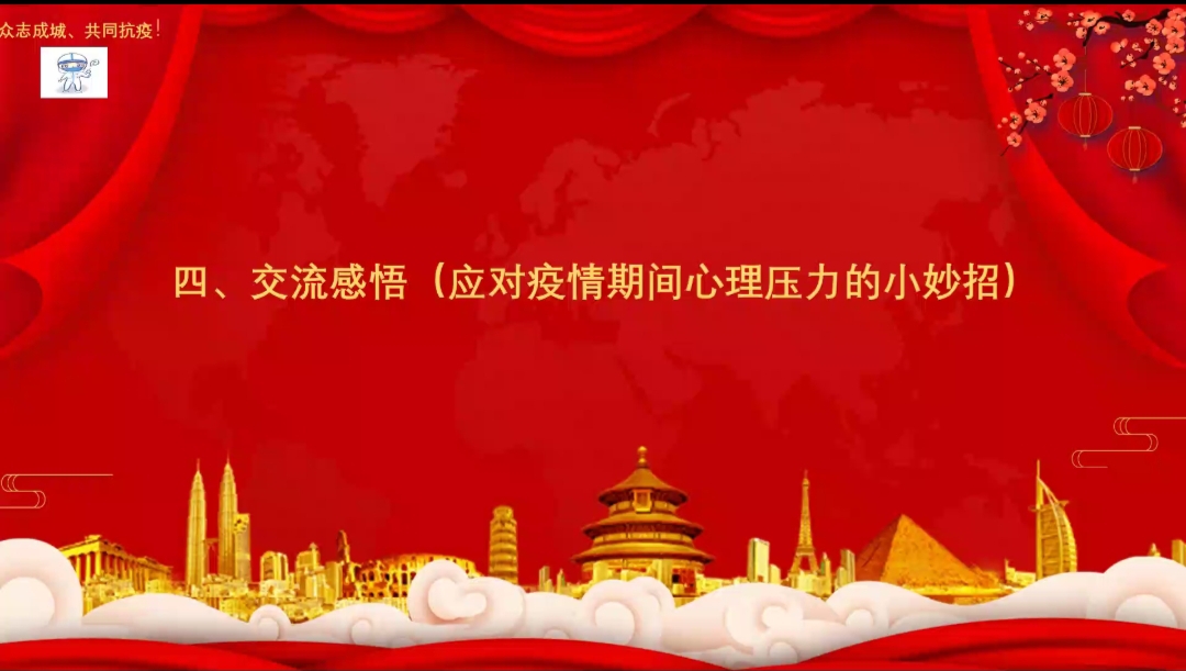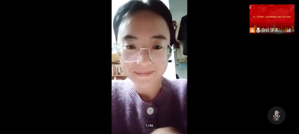 随后会计学本科生党支部与预科学院的志愿者们就如何应对压力进行了经验交流。会计学本科生党支部志愿者管雯表明要合理安排作息时间,面对负面情绪时要适度转移注意力,适当做运动,必要时可进行心理辅导,也希望大家能够调整心态,积极配合相关工作。会计学本科生党支部志愿者杨飞建议做一些容易达成的事情,如听歌等,静下心来调整心态,理解工作人员。预科学院志愿者穆奋梅建议同学们明确压力的来源,做适当的楼间运动,室友之间可以相互按摩,促进情感交流。会计学本科生党支部志愿者李娜表示,要适当运动,可以通过聊天倾诉,保持开心快乐。预科学院志愿者黑花表示要劳逸结合,适当自我宣泄,同时可以让旁人疏导,进行情绪转移。预科学院志愿者罗佳蓉表示这次疫情记忆最深的是郭利老师给隔离的学生们进行了线上交流以此来疏导大家的心理,教导大家调节负面情绪。郭利老师和原博老师又同隔离学生讨论了日常生活问题,使同学们能够安心的在宿舍上课。我们相信前路光明,阴霾终将散去,我们定同舟共济,风雨共度。志愿抗疫,使命必达。最后给同学们一点小建议,在被封的日子里,大家可以和舍友看看电影,唱唱歌来缓解一下心理压力。预科志愿者玛依热代表新疆同学发言,她表示能够参与此次志愿工作,感到十分自豪,也感受到了同学之间的团结、温暖与友爱。她在这次志愿活动中通过奉献实现了自我价值,提高了个人能力,扩展了社交圈,同时表示可以通过唱歌、打游戏来缓解压力。