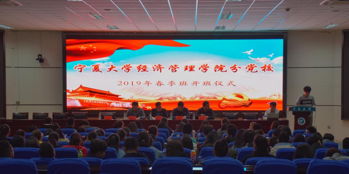分党校2019年春季班开班仪式于贺兰山校区文荟楼东报告厅召开。学院党委书记张桓,党委副书记程胜利、李琦,新疆内派教师巴塔,经济学本科生党支部书记何韶华参加本次会议,第三十三期入党积极分子暨第九期发展对象到场学习。开班仪式由李琦主持。