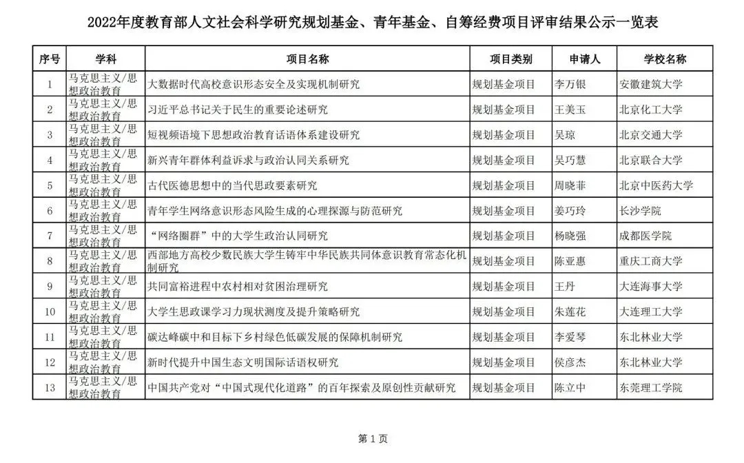 近日,中华人民共和国教育部社会科学司发布2022年度教育部人文社会科学研究规划基金、青年基金、自筹经费项目评审结果公示一览表,其中,规划基金、青年基金、自筹经费项目共2617项通过专家评审;西部和边疆地区项目165项,新疆项目19项,西藏项目1项通过专家评审。中国特色社会主义理论体系研究专项30项,高校辅导员研究专项208项通过专家评审。