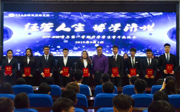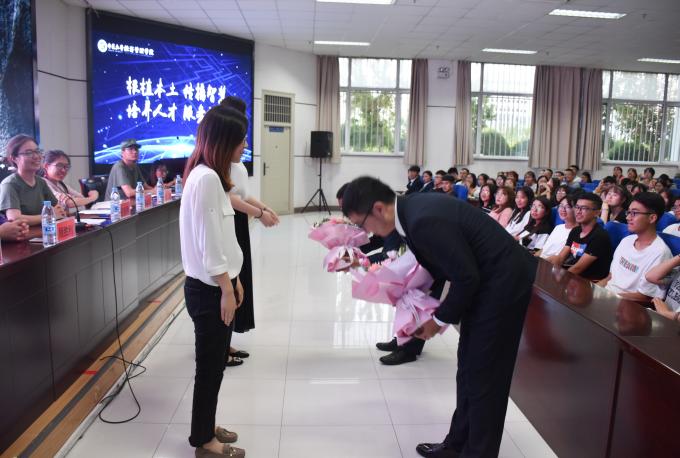 会议伊始,由学生骨干交流发言,生活权益部部长金向琴与2017级经济学金融班班长安纪钊回首了自己在过去一年的收获并对自己及学生干部们提出了更高的要求。2019年暑期社会实践代表马旭东、夏溦与在师生们分享了他们在社会实践中所思所想。紧接着,刘洋坦言,担任辅导员期间,她更好地认识了自己、认识了学生工作。张景则动情地向她的领导、同事以及一路相伴的同学们表达了谢意,并借习近平总书记的话“有梦想还要脚踏实地,好好学习才能梦想成真。”对同学们提出两点期望:同学们应学会换位思考、与人为善;应做到对自己负责。姚硕也寄语于同学们“让优秀成为一种习惯”。学生代表为刘洋、张景献花并合影留恋,学院领导为2018级班主任助理颁发了聘书。临末,程胜利对会议进行了总结,向同学们提出了新的要求,教导同学们确立新目标,不忘初衷、继续砥砺前行。