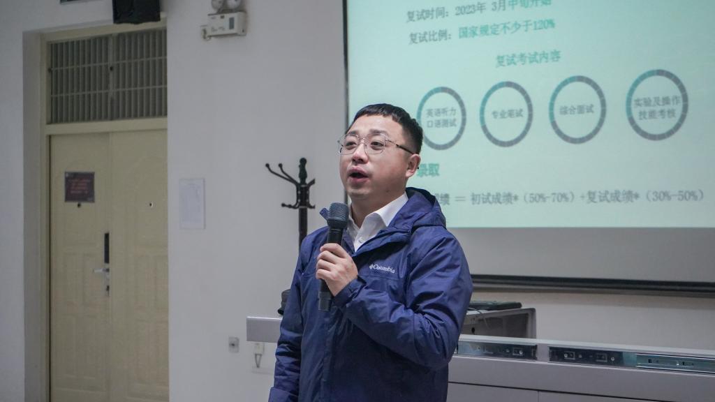 讲座伊始,三位研究生学长依次向大家分享了考研和择校经验,并建议同学们能一战成硕就不要二战,考研期间应全身心投入复习。顾海源就为什么考研、考研的意义展开讲解,鼓励同学们继续学习深造为将来更好的就业打下基础。通过举例和分析历届录取分数线,区别热门学校热门专业、热门学校冷门专业、冷门学校热门专业、冷门学校冷门专业四个概念帮助同学们更加认清当前的考研形式,并鼓励大家确定目标,努力学习。考研是一场持久的拉锯战,如何择校选专业、如何准备研究生各阶段考试、如何安排学习时间,好的选择能把努力发挥最大化。顾海源根据自己潜心研究的宝贵经验,向在座学生传授他的备考策略,希望考生们能够刻苦认真,扎实打牢基础,为自己的未来努力打拼。