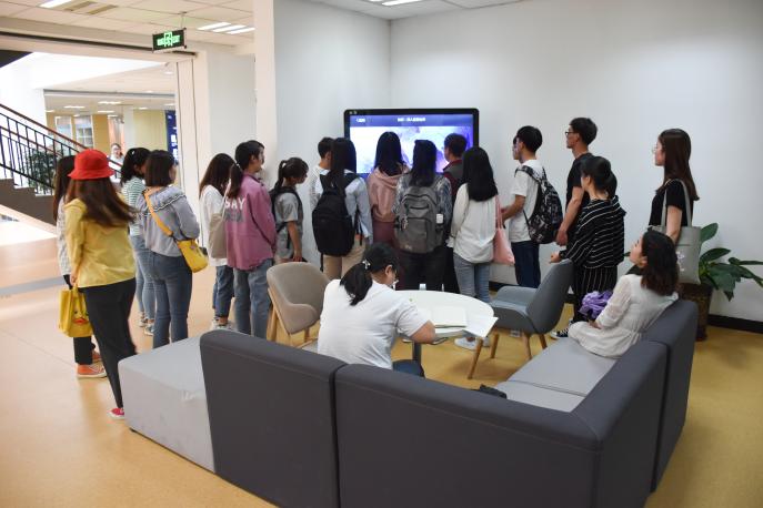 馆内难以计数的棕黄色书架有序地排列在落地窗边,世人瞩目的名著、云淡风轻的散文、富含哲理的中外诗篇整齐地放置在书架上,包围着读者,沉浸书海的感觉油然而生;同学们可以利用图书电子瀑布流,通过微信扫码,将喜爱的图书收藏在手机中免费阅读。此外,馆内的研修间也是一大特色,它为学生提供了一个独立、安静的场所,同学们可以通过线上预约的形式,在这个小空间里准备考研、准备各类创新创业比赛。馆内还设置了中国历代馆藏书画电子艺术馆及全球高清纪录片等数据库资源,用简单直接的方式将图书馆的资源展现在读者面前,同学们通过扫码便可以获取信息,消除了数据鸿沟……