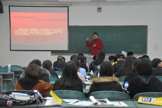 活动于晚自习期间举办,各班采用多种形式向大家展现十九大内容与精神,分享学习心得与体会,同学们认真聆听、踊跃发言。例如,17级信息管理班,班长精心制作了PPT进行汇报,与大家分享自己的领悟;17级物流班则选择采用提问新党章内容的方式,使大家对党章内容熟悉了解。