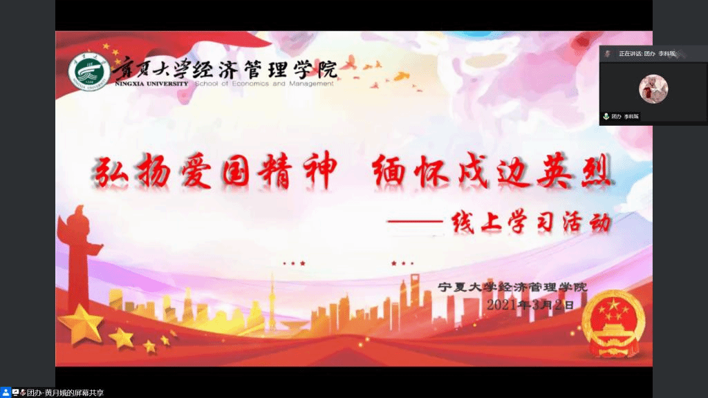 举行了以“弘扬爱国精神缅怀戍边英烈”为主题的线上学习活动。学院辅导员何韶华、艾萨·阿尤普、孙文元以及十七届第二期团委、学生会、校园文化传媒中心所有成员参加了此次活动。活动由团委副书记马利君主持。