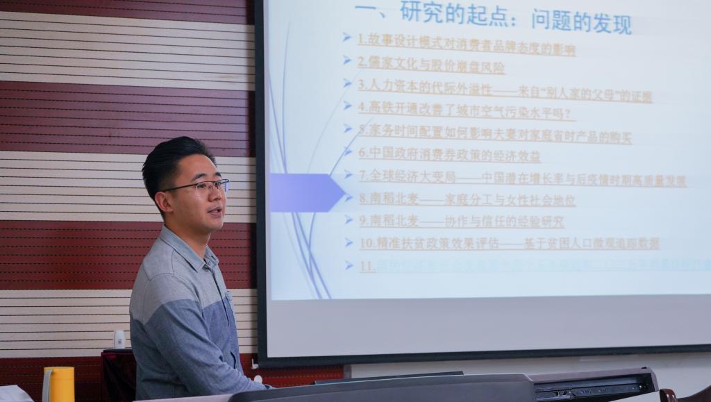 任何的研究不能没有一个起点,而所有的起点都是一次问题的发现。张特博士首先就如何确定论文的选题做出了详细的分析,他说道,我们的选题要具有研究意义,要足够新颖,为此,他向同学们分享了近年来发表在权威期刊上的如《儒家文化与股价崩盘风险》、《南稻北麦——家庭分工与女性社会地位》等十篇优秀论文,并对其从题目到内容做了详细的解读。在随后讲述的引言、文献综述与分析框架部分,张特博士从研究背景、研究目标、研究思路、研究内容、研究价值与意义几个方面与在场同学展开交流。张特博士条理清晰,思路严谨,会场不时响起热烈掌声。在分享有关数据来源与描述性统计、政策评估、效率评价等关于数据、方法与模型的处理时,张特博士根据自己的经验分享了一些实用的技巧。随后的实证分析、结论与政策建议部分,张特博士通过《中国农业生产效率与减贫效率研究》,剖析了隐藏于其中的关键点。在交流会的最后,现场的同学就自己平时写论文所遇到的问题与困难向张特博士请教。通过张特博士细致的分析,同学们茅塞顿开,纷纷表示自己从此次的交流会中获益匪浅。