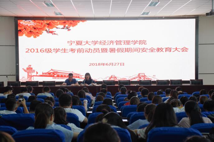 2015、2016、2017级学生考前动员大会暨暑假期间安全教育大会在贺兰山校区文荟楼东报告厅举办。学生工作办公室主任黄旭兴、各年级辅导员及三个年级全体学生分别到场参加。