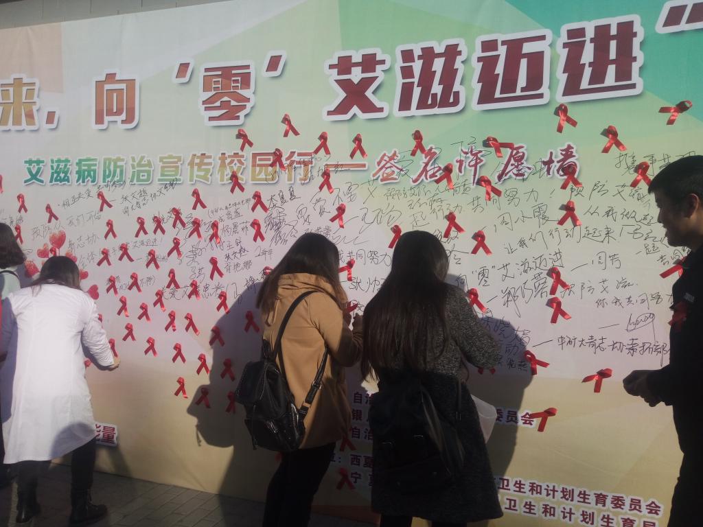 此次活动主要包括签字仪式、寄托祝福、知识讲解、宣传展板展示与艾滋病预防宣传五个环节。围绕今年的宣传主题,西夏区人民政府等相关部分的相关领导和负责人亲临现场组织活动,各参与单位的医务人员佩戴红丝带对过往群众进行了现场艾滋病防治知识宣传。现场悬挂主题横幅,展出艾滋病宣传版面,发放艾滋病宣传小册、安全套等预防物品若干。其中在艾滋病预防宣传这一环节还为广大师生提供了免费检测身体的贴心服务,结果会在20分钟之后以短信形式发到检测者的手机中,保障了个人的隐私问题 。本次活动最后,同学们在“携手抗艾、重在防御”预防艾滋病宣传条幅上进行签字,表示愿意为抵抗艾滋病宣传贡献自己的力量。