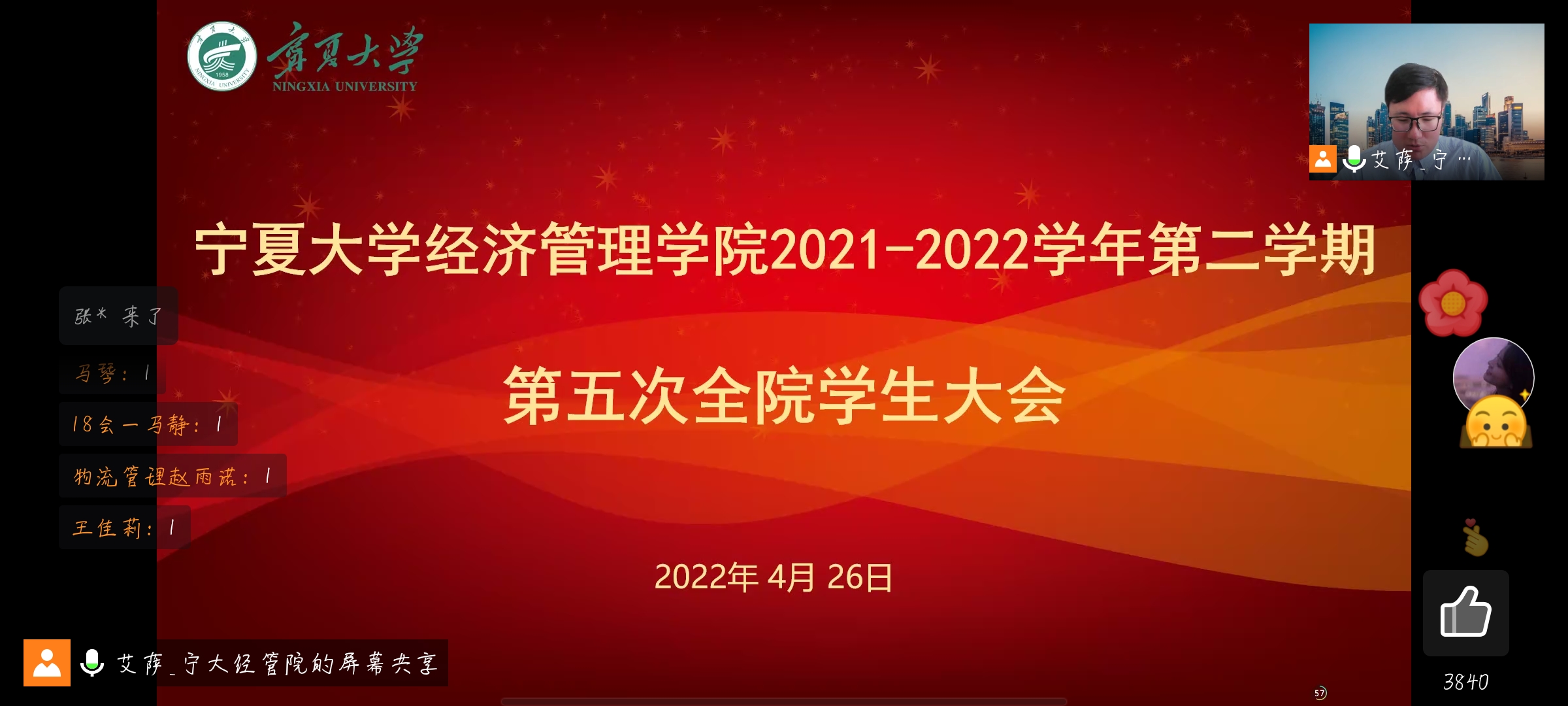 党委副书记马建宏、常江,教学科研办公室副主任梁非凡,党建秘书姚硕,学生工作办公室辅导员艾萨•阿尤普、孙文元、禹文杰,李立朋、李杨等教师,学院全体本科生、研究生参加会议。会议由艾萨主持。