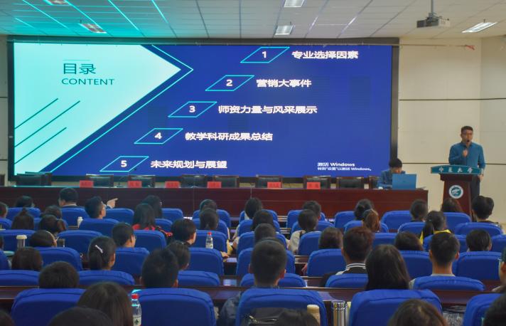 会议伊始,冯蛟从专业选择因素、师资力量、教学科研成果等方面分析市场营销专业的优势和前景。虎兴武补充:应本着个人兴趣去选择专业,希望大家切合未来规划谨慎选择。其次,杨彩铃着重介绍了学生学习、实践、创新能力的培养。她强调:工商管理专业拥有雄厚的资源、良好的国际交流学习机会、精锐的师资团队及广阔的实习平台,以培养复合型、应用型人才为目标。