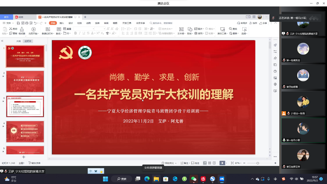 第十六期“青年马克思主义者培养工程”暨团学骨干培训班第一讲在线上顺利举行。学生工作办公室负责人艾萨·阿尤普,团委副书记孙文元,第十六期青马班成员参加本次培训。本次培训由艾萨主讲。