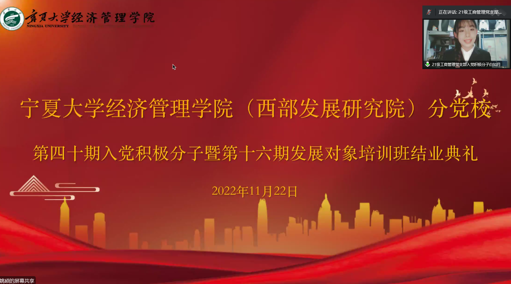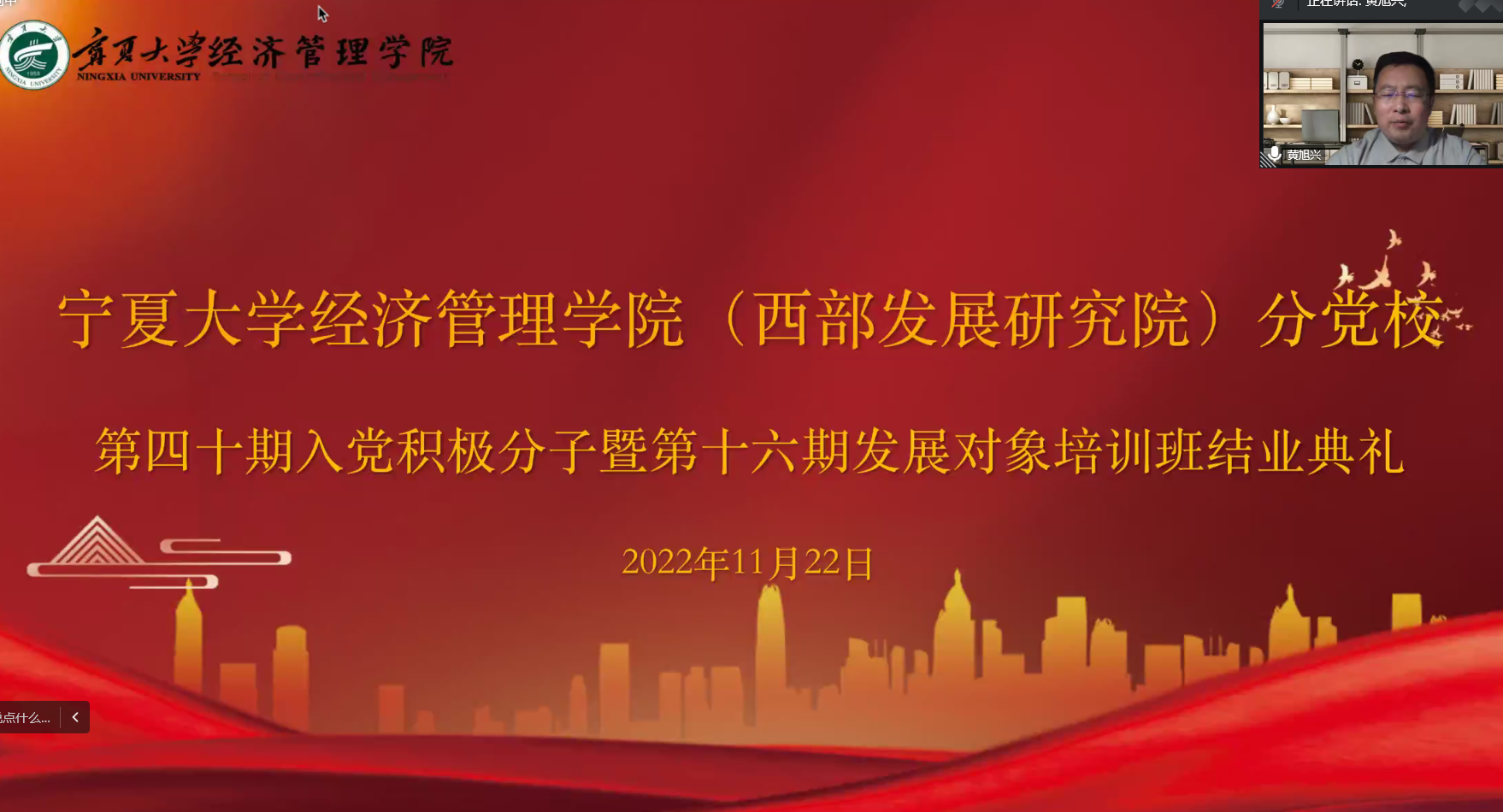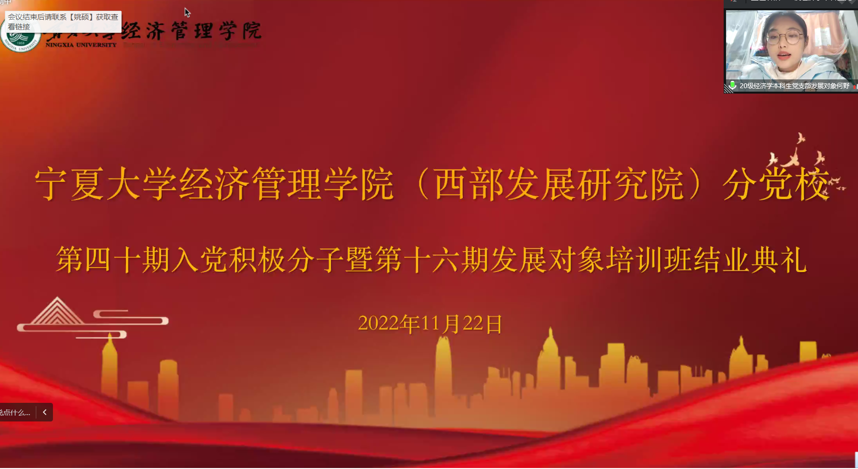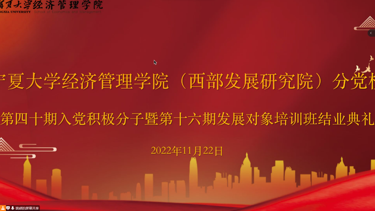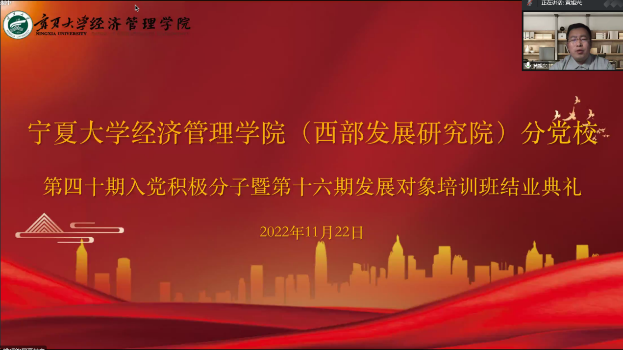 11月22日下午,17k小说 分党校第四十期入党积极分子暨第十六期发展对象结业典礼在线上顺利举行。院党委副书记黄旭兴、党建秘书姚硕、第四十期入党积极分子和第十六期发展对象参加了会议。会议由姚硕主持。