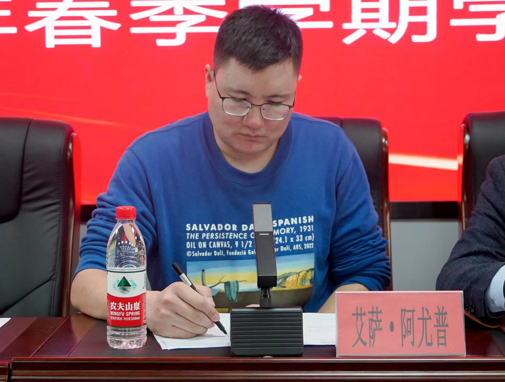 党委书记崔明堂,党委副书记常江,学生工作办公室负责人艾萨•阿尤普,党建秘书姚硕,团委副书记孙文元,研究生辅导员李杨、辅导员张春娜以及全体团学骨干参加会议。会议由艾萨主持。