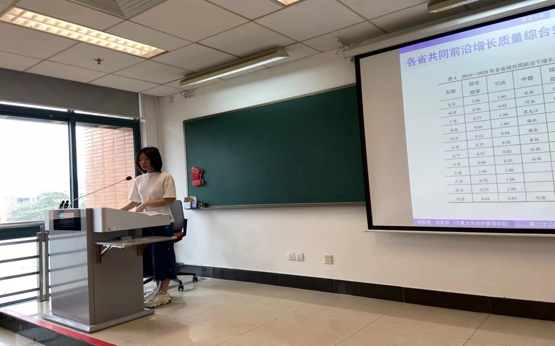 硕士研究生刘星源汇报了论文《中国省域增长质量效率研究》,论文运用DEA模型构建了经济增长、环境治理和生活质量两阶段分析框架,将固定资产投资、能源消费、工业污染治理投资等作为投入变量,居民可支配收入、预期寿命等作为期望产出,测算了中国经济增长质量效率。