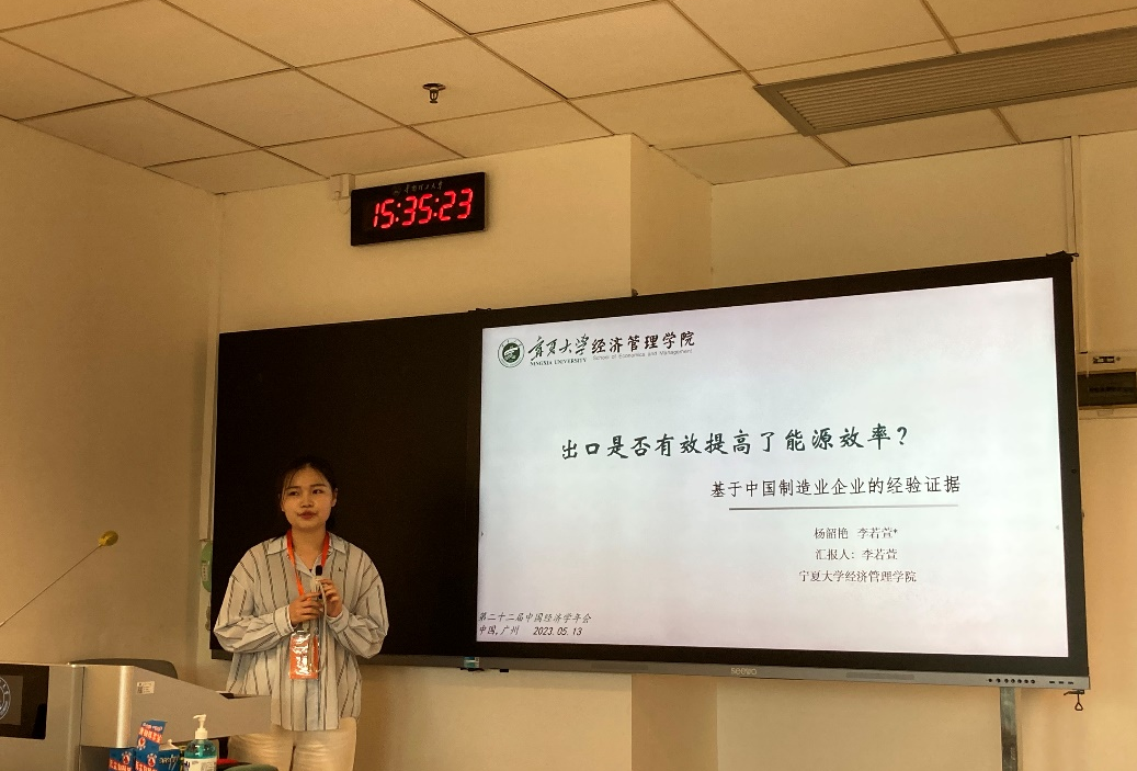 硕士研究生李若萱汇报了论文《出口是否有效提高了能源效率?——基于中国制造业企业的经验证据》。论文以通过出口加快经济外循环从而提高能源效率是当前中国经济高质量发展的重要途径为背景,选用中国制造业企业为样本,采用PSM方法对出口行为是否会影响制造业企业能源效率进行了实证检验。研究发现:相较于非出口企业,出口企业能源效率的提升较快。在机理分析中,发现出口企业通过技术效应、结构效应提升企业能源效率,且数字化水平和绿色化水平加快了出口对能源效率的正向促进作用。