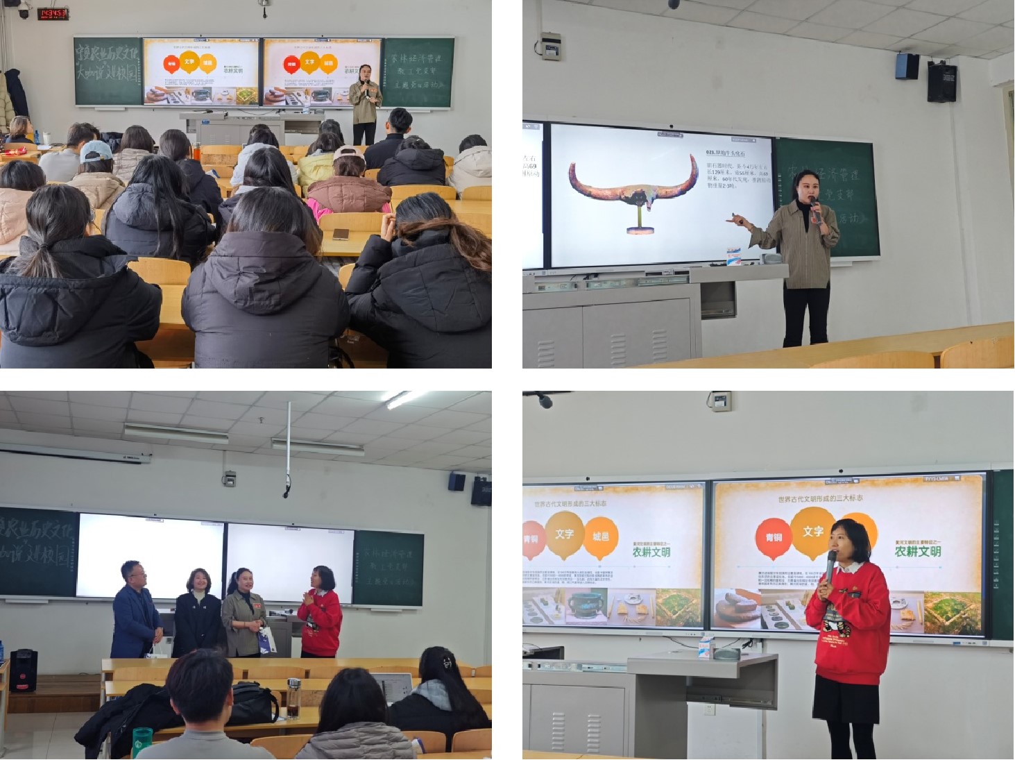 “大咖说”是国内博物馆深度讲解标杆品牌,现已开放北京、西安、成都、苏州、南京、上海、宁夏等全国15个重点博物馆的精讲服务。“大咖说”宁夏讲师团的讲师木琴、吴晓娟、吴鹏进校园,将“口口相传的力量”传递给大学生,极大地拓展了他们的专业知识面。木琴老师以宁夏丰富的物质文化遗产为切入点,以世界灌溉工程遗产宁夏引黄古灌区,第七批中国重要农业文化遗产宁夏平原引黄灌溉农业系统等为例,生动地拉开了宁夏的历史画卷。通过对宁夏博物馆中各类珍贵展品的详细讲解,如西汉回首卧式错金银铜羊、战国虎噬驴透雕青铜牌饰、鎏金铜牛、西夏石马等,巧妙地串联起了宁夏的农业文化历史。同时,木琴老师还深入讲述了水洞沟遗址、鸽子山遗址、姚河塬遗址等内容,并将丝路文化贯穿其中,为师生们呈现了一幅异彩纷呈、源远流长的宁夏农业历史文化画卷。“大咖说”宁夏讲师团为现场积极互动的学生赠送了博物馆文创产品团扇,王琳瑛老师代表农林经济管理教工党支部为三位老师赠送宁大文创礼物及盐池县博物馆文创摆件。