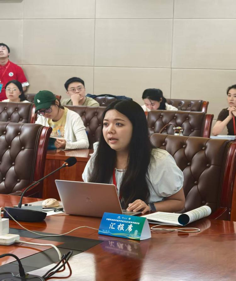 研究生苏贵芳报告了“参与农村产业融合对农户绿色生产转型的影响”。研究基于大样本农户调查数据,发现当前农户绿色生产转型总体水平不高,但参与农村产业融合通过技术溢出、市场拉动与规范认证三条路径显著推动其绿色转型行为,尤其在新型经营主体和示范区内效果突出。李敬锁教授充分肯定该研究的现实意义,并建议进一步剖析不同融合模式(如农业+文旅、农业+康养、农业+数字)的差异化影响机制。