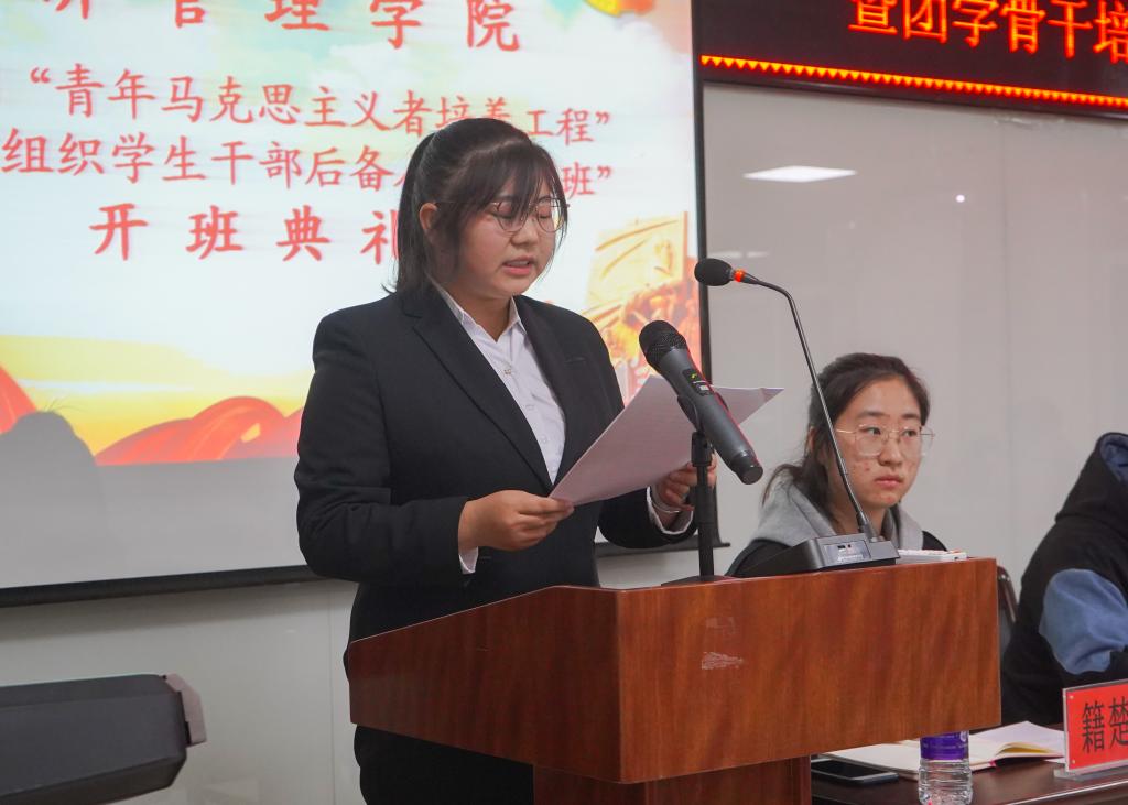 青马班学员、2020级农林经济管理班马紫芸代表全体青马班学员发言。她讲到要“不忘初心,保持热情,在青马班培训工作中学习成长,从而在将来更好地开展团学工作。”慷慨激昂的话语,说出了20级团学骨干渴望接受培训的心声,道出了20级团学骨干努力干好工作的决心。