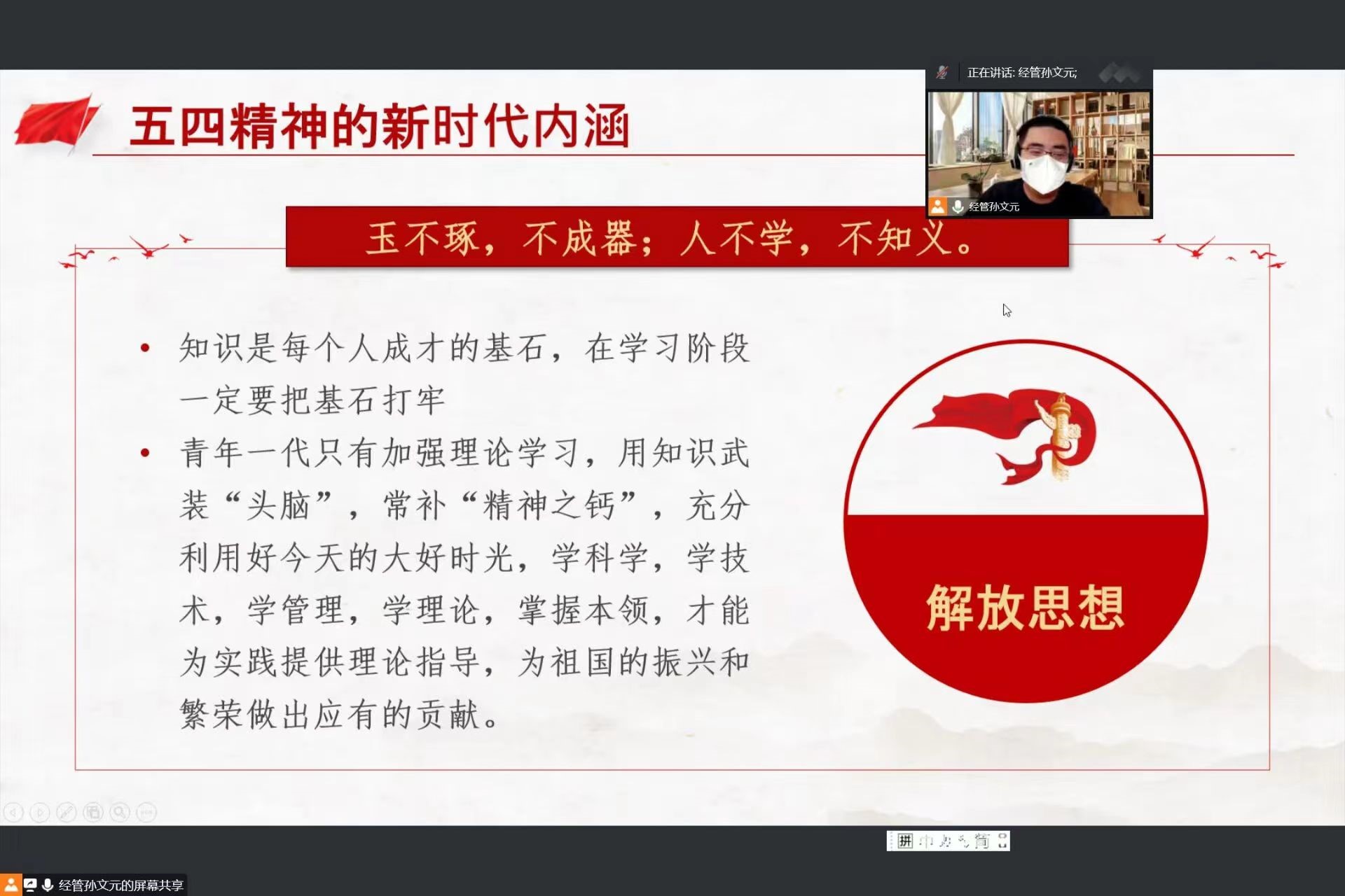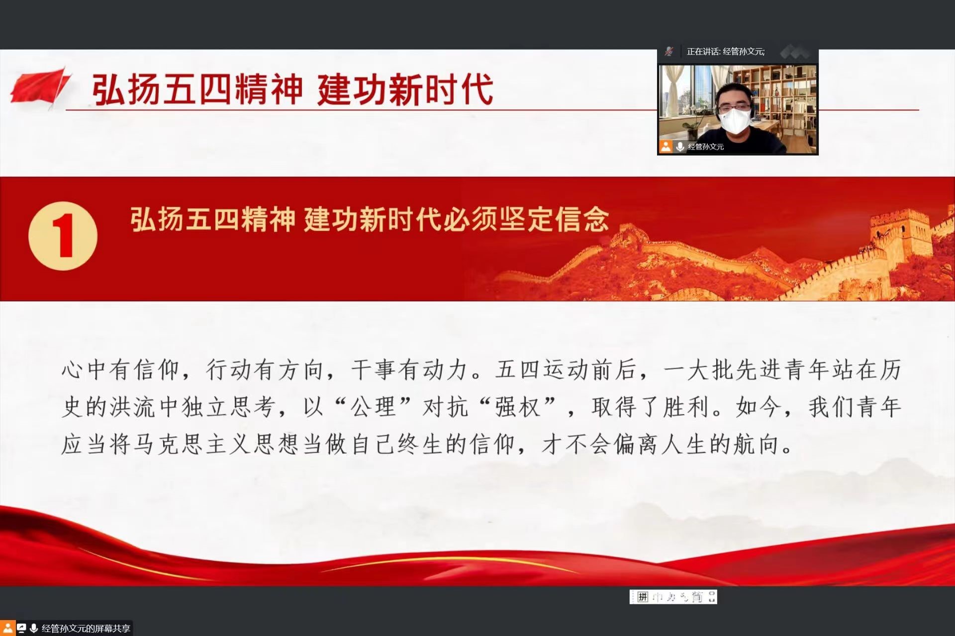 第十六期“青年马克思主义者培养工程”暨团学骨干培训班第二讲于线上顺利举行。团委副书记孙文元、第十六期青马班成员参加本次培训。本次培训由孙文元主讲。